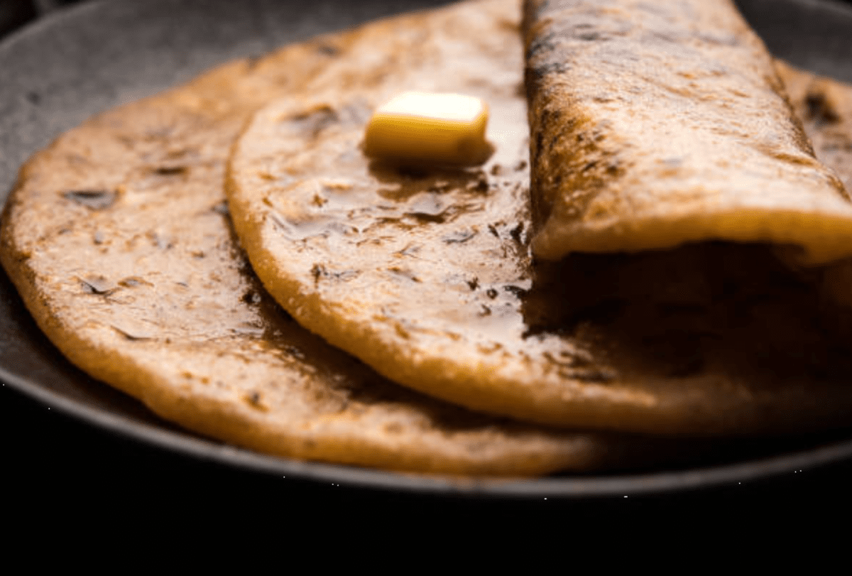 - Roast on a hot tawa with ghee until golden brown spots appear.