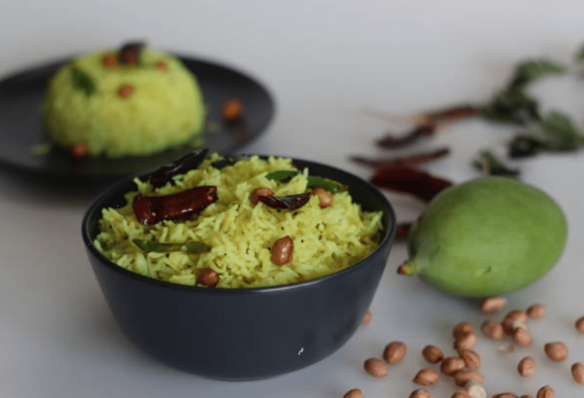 A seasonal tangy rice dish made with grated raw mango, tempered spices, and curry leaves; a summer delicacy in Andhra cuisine.